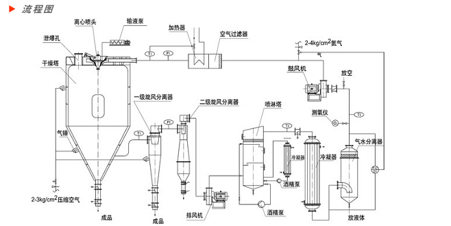 閉路循環(huán)離心噴霧干燥機系統是在密閉的環(huán)境下工作,干燥介質(zhì)為惰性氣體,一般為N2,適用于有機溶劑的物料干燥有毒氣的物料或干燥過(guò)程中易發(fā)生氧化的物料的干燥;該系統采用惰性氣體作為循環(huán)氣體,對干燥的物料具有保護作用,循環(huán)氣體經(jīng)歷載濕、去濕的過(guò)程,介質(zhì)可重復使用;氮氣經(jīng)加熱器加熱后進(jìn)入干燥塔,液體物料經(jīng)螺桿泵輸送至離心噴頭處,液體被高速循環(huán)的霧化器霧化成液滴,在干燥塔內完成熱質(zhì)交換過(guò)程,被干燥后的粉狀物料從塔底排出,被蒸發(fā)的有機溶劑氣體在風(fēng)機負壓的壓力下,把夾在氣體中的粉塵經(jīng)旋風(fēng)分離器、噴淋塔除塵后飽和的有機溶劑氣體經(jīng)冷凝器冷凝成液體排出冷凝器,不凝性氣體介質(zhì)連續加熱后作為干燥載體在系統內重新循環(huán)使用。而常規的普通的離心噴霧干燥是通過(guò)不斷的送、排風(fēng)達到排濕的目的,這也是防爆型閉式離心噴霧干燥設備與普通離心噴霧干燥設備的一個(gè)明顯區別;干燥系統內干燥介質(zhì)為N2,內部為正壓操作,保持一定的正壓值,如果內部壓力下降,由壓力變送器來(lái)自動(dòng)控制N2進(jìn)量,保證系統壓力平衡。